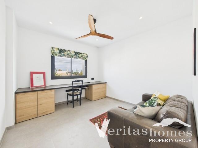 La villa s’étend sur 332 m² sur trois niveaux, avec un salon, une salle à manger et une cuisine décloisonnés au rez-de-chaussée, avec un poêle à granulés et une élégante cuisine à comptoir en quartz avec des appareils Bosch haut de gamme, y compris des fours muraux doubles et un refroidisseur à vin intégré. Une buanderie séparée, un vestiaire pour les invités et une chambre double (actuellement utilisée comme bureau) complètent ce niveau. A l’étage, trois chambres spacieuses offrent confort et intimité, la suite parentale disposant d’une terrasse privative, d’une salle de bains privative avec baignoire et douche à l’italienne, et d’un généreux dressing. La deuxième chambre dispose également d’une salle de bains, tandis que la troisième bénéficie d’une vue sur la mer et d’un accès à une salle de bains séparée.
