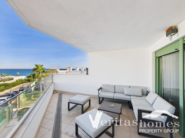 L'appartement se compose d'un salon-salle à manger lumineux avec climatisation et portes-fenêtres donnant sur la terrasse couverte. La terrasse offre une vue sur la mer, est orientée au nord et bénéficie du soleil le matin et en début d'après-midi. Son emplacement en angle offre une vue dégagée et elle est actuellement meublée d'une table et d'un canapé.